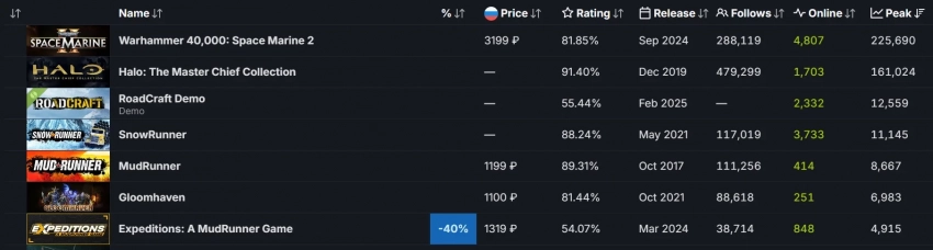 Кого не смогла обогнать «Готика», так это симулятор RoadCraft. За него ответственны разработчики из Saber Interactive — демоверсия привлекла более 12,5 тысячи человек. Для сравнения, подобных цифр нет даже у полноценных версий SnowRunner и MudRunner.