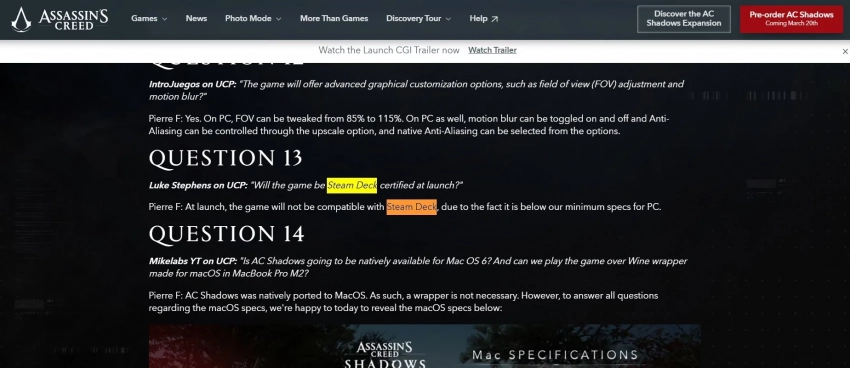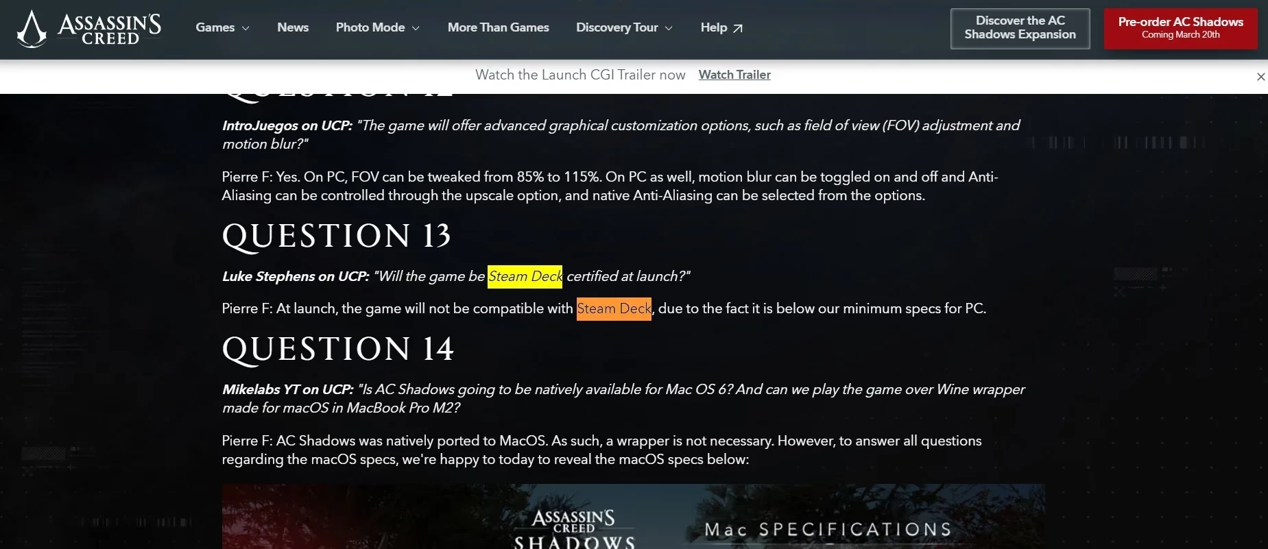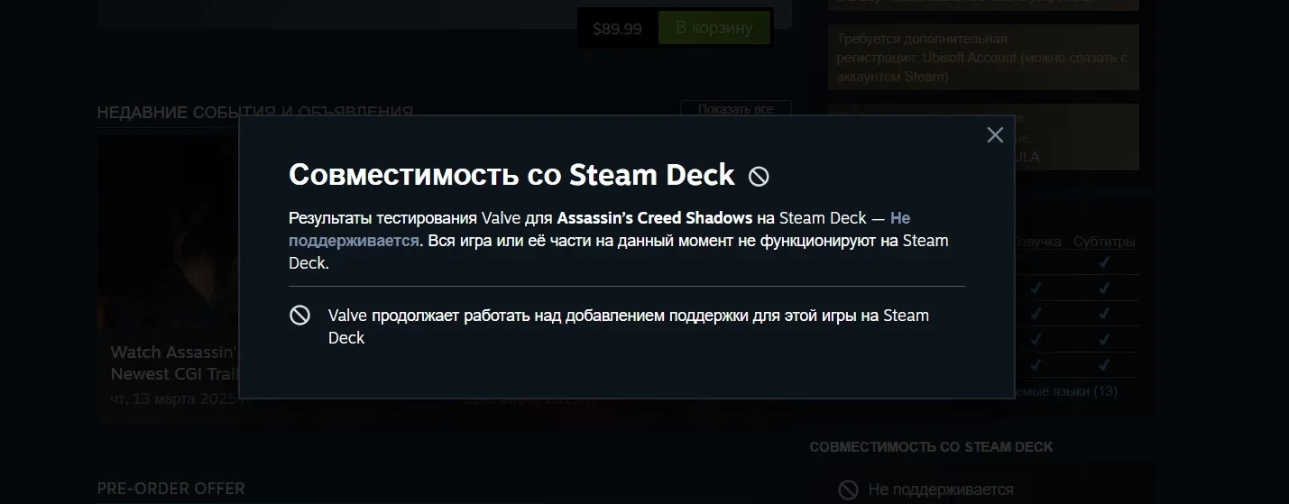 При этом ещё в прошлом месяце технический директор Assassinʼs Creed Shadows утверждал, что игра не будет совместима со Steam Deck по причине её несоответствия минимальным системным требованиям (подробнее о них) портативной консоли.