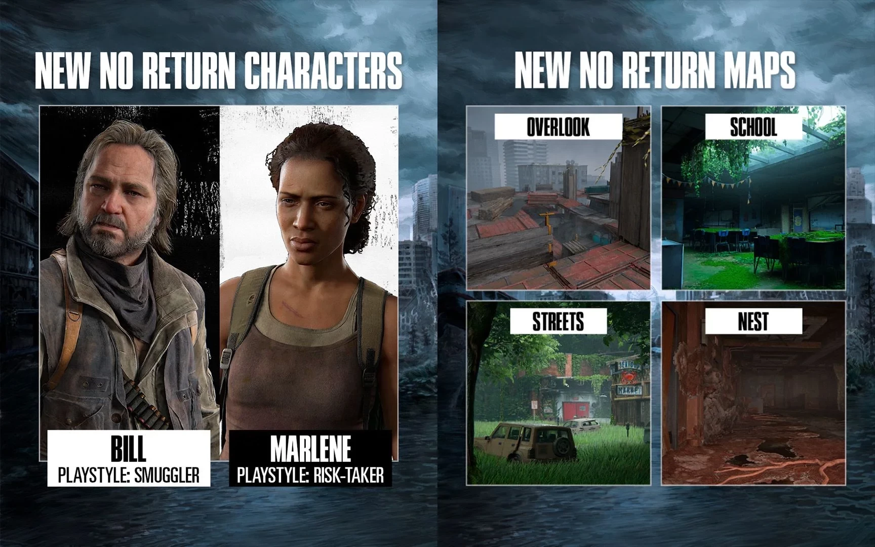 Помимо этого, разработчики анонсировали новый контент для режима No Return. Все игроки смогут сыграть за ещё двух персонажей. Билл представит контрабандиста, вооружённого помповым ружьём и дающего бонус к трофеям, но неспособного уклоняться. А Марлин вооружена штурмовой винтовкой и раз за забег способна изменить свой путь.