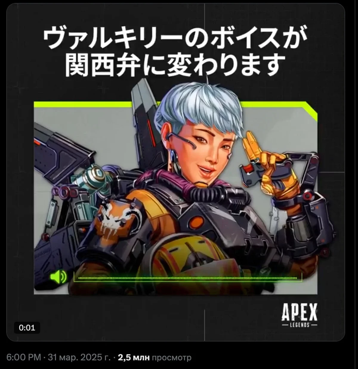 EA Japan объявила, что со следующим обновлением Apex Legends у Валькирии изменят голос — теперь она будет говорить с кансайским диалектом