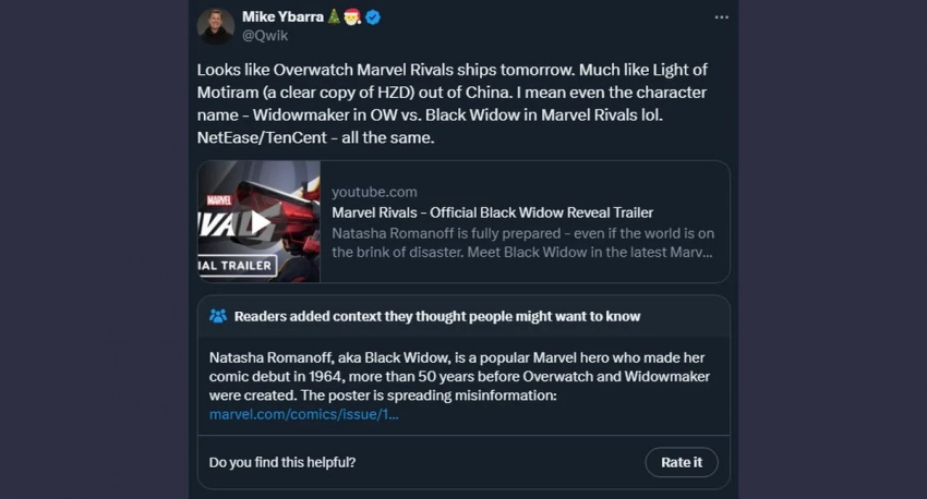 В ныне удалённом твите Ибарра назвал Marvel Rivals клоном и сравнил игру с Light of Motiram компании Tencent — боевик уж слишком похож на знаменитую Horizon Zero Dawn, чтобы считать его оригинальным проектом.