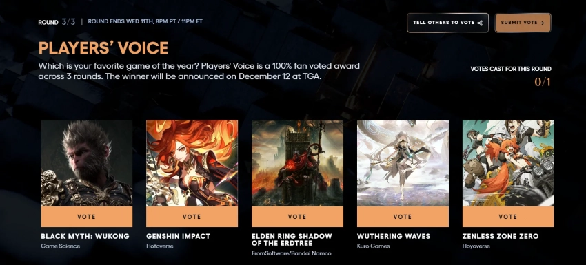 Голосование продлится до вечера 11 декабря, а победителя назовут на церемонии The Game Awards 2024. Она начнётся 13 декабря в 3:30 МСК.