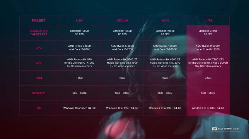 Увы, в The Alters Benchmark Tool нельзя сыграть — это просто инструмент для проверки «железа». Однако он носит массу полезной информации о предустановках графики, целевой производительности и необходимых характеристиках PC. Во всех случаях геймерам потребуется 50 ГБ свободного пространства на SSD, а также 16 ГБ оперативной памяти. Исключением стали ультра-настройки, где понадобится 32 ГБ «оперативки» — зато играть можно будет в 2К-разрешении (с апскейлом) и 60 FPS.