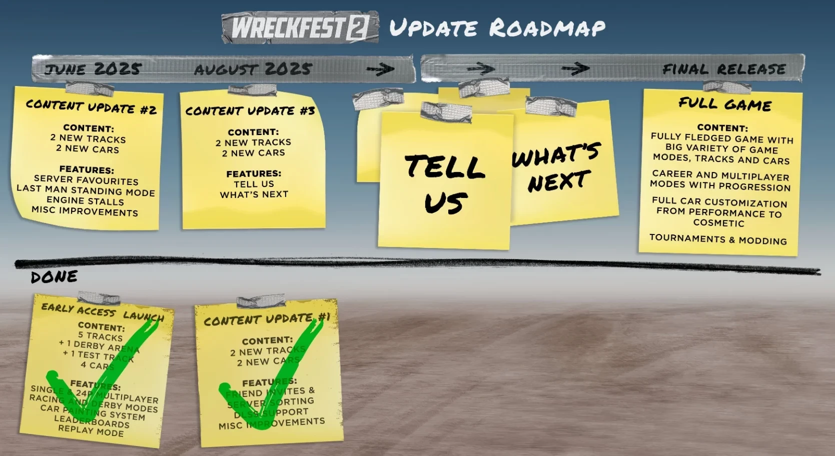 Также разработчики обновили дорожную карту, куда было включено третье контентное обновление. Оно выйдет в августе. Конкретные новинки не называются, но игроки могут ждать по паре новых автомобилей и гоночных треков. В целом же Wreckfest 2 продолжает приближаться к выходу из раннего доступа — в момент полноценного релиза игра получит обширный список режимов, большой парк транспорта, режим карьеры, поддержку моддинга и не только.