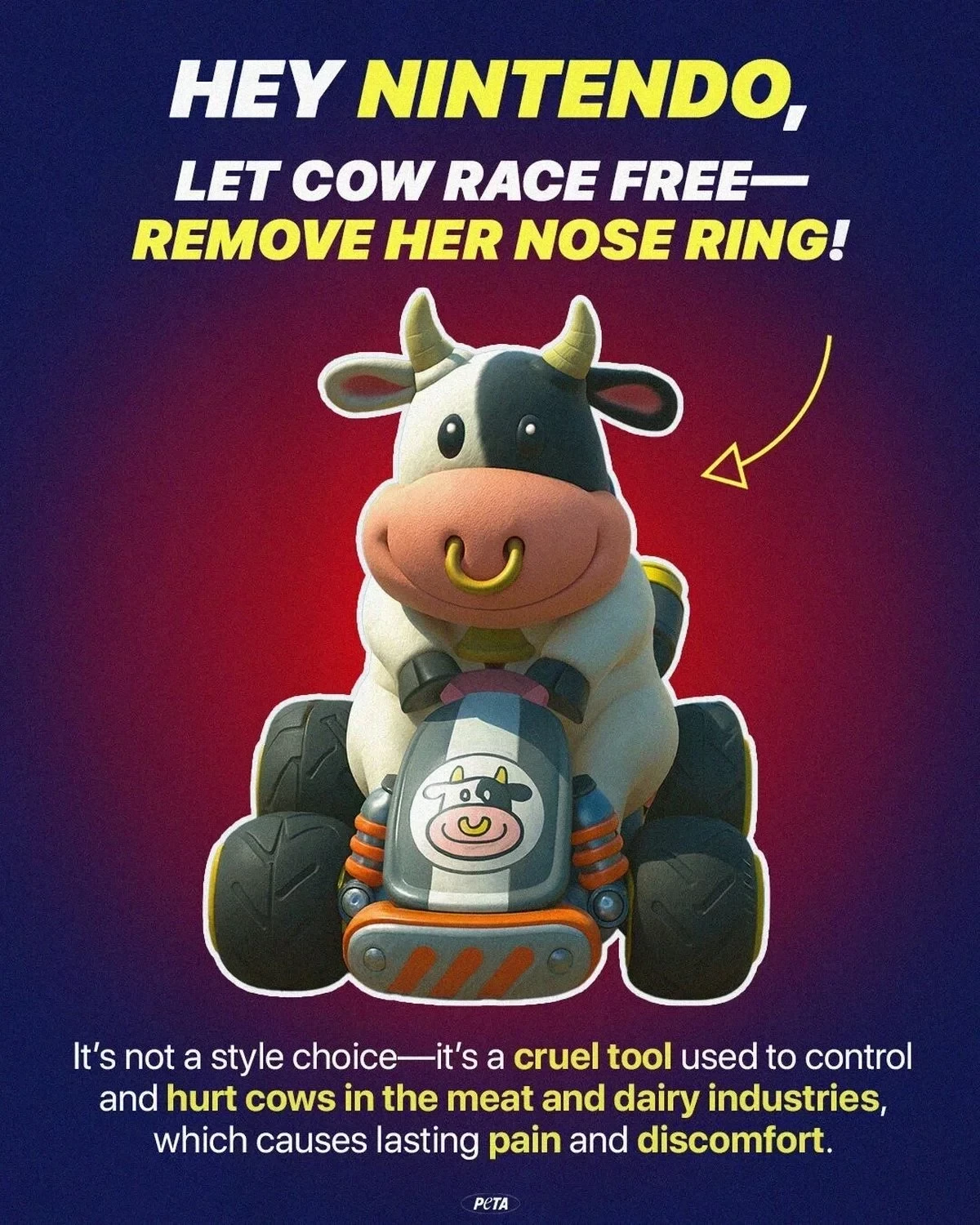 Свежий пример — Mario Kart World, пока что один из немногочисленных эксклюзивов Switch 2. Организация по защите животных PETA обратилась к японскому гиганту с просьбой изменить дизайн одного из персонажей — Коровы.